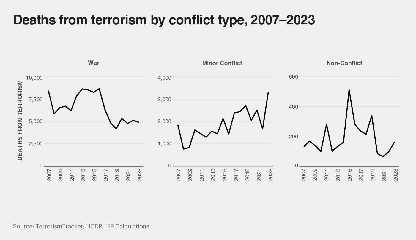 2023年,超过90%的袭击和98%的恐怖主义死亡事件发生在冲突国家。2022年受恐怖主义影响最严重的10个国家均卷入了武装冲突,冲突中的恐怖主义烈度也远高于非冲突国家,每次袭击平均造成2.7人死亡。